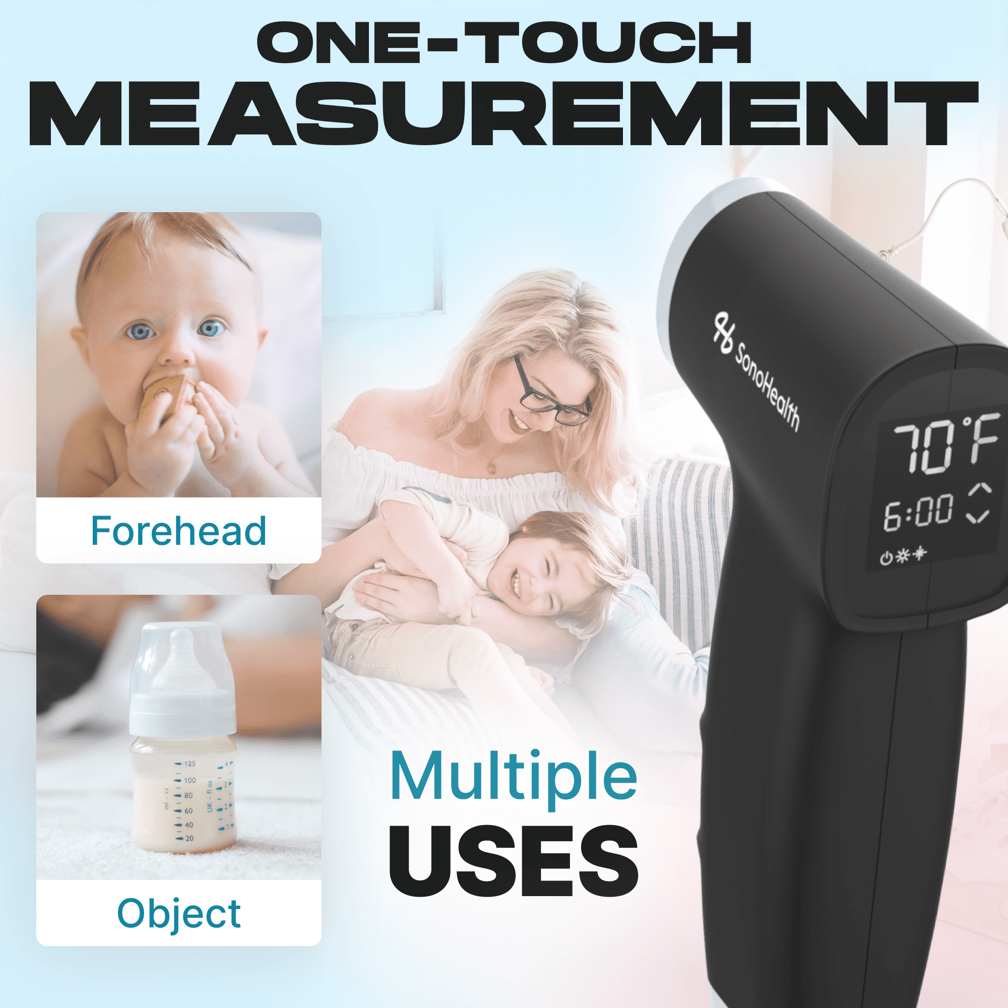 The straightforward and clever one-button operation, coupled with an innovative design, makes our forehead thermometer perfect for seniors, adults, children, and infants, ensuring simplicity, convenience, and ease of us.